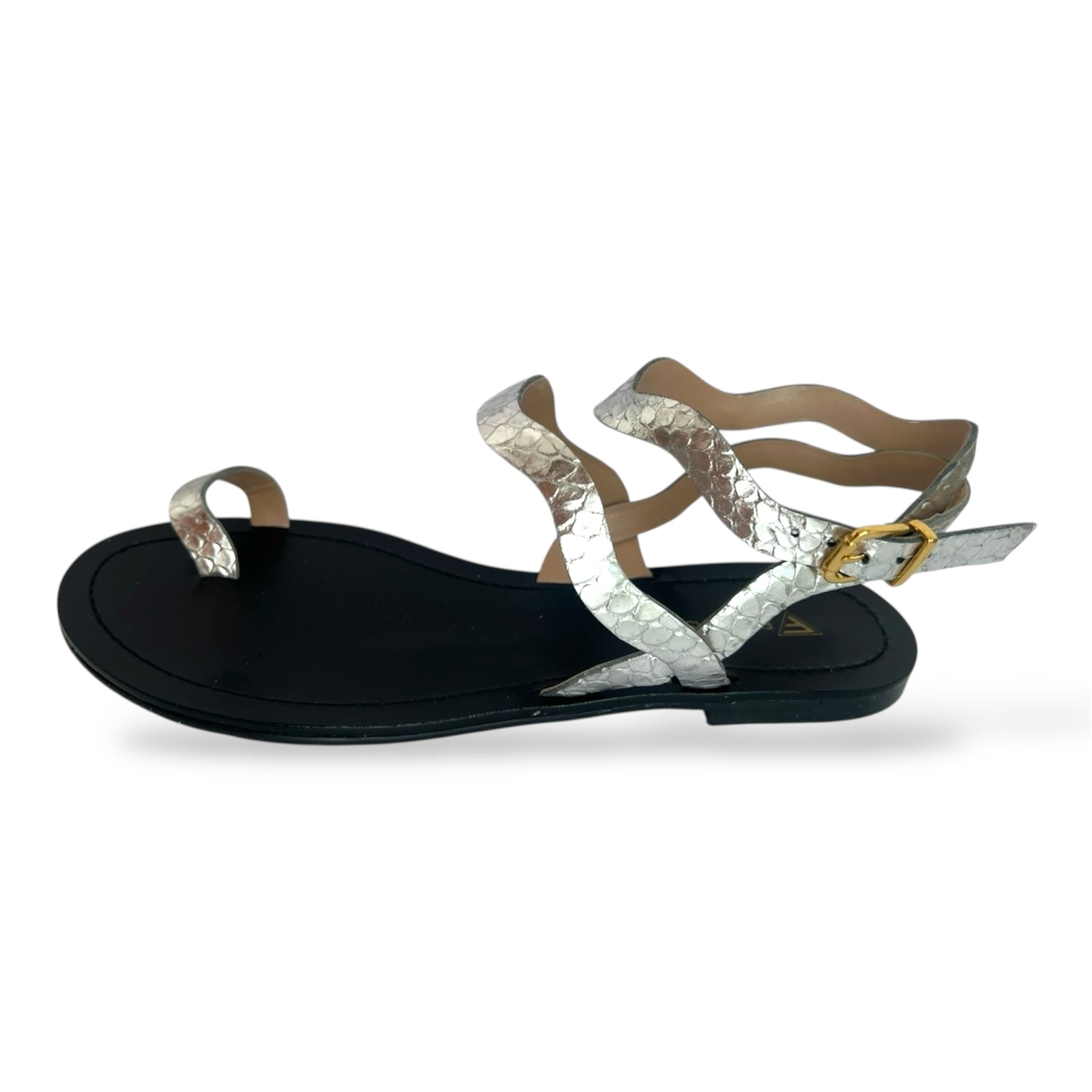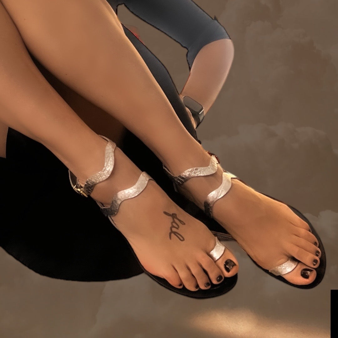 Sandália rasteira de tiras em couro, com solado em borracha.