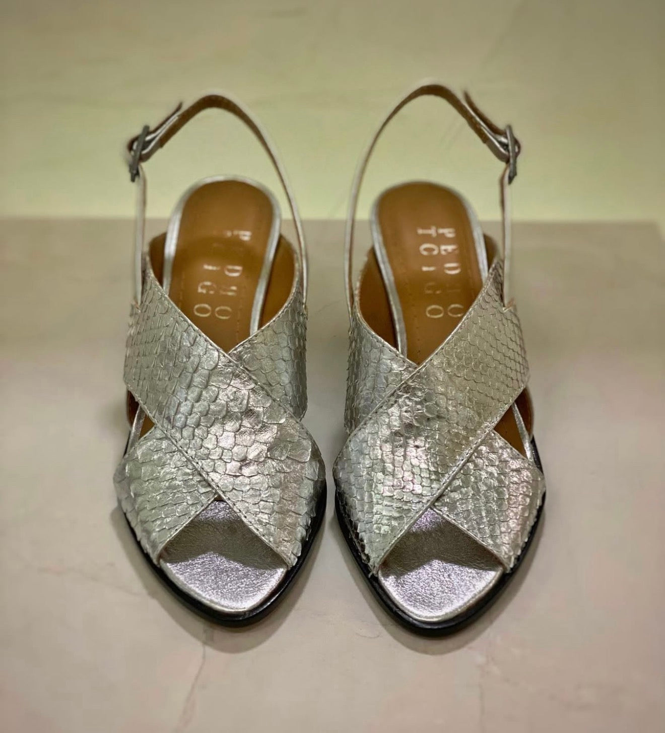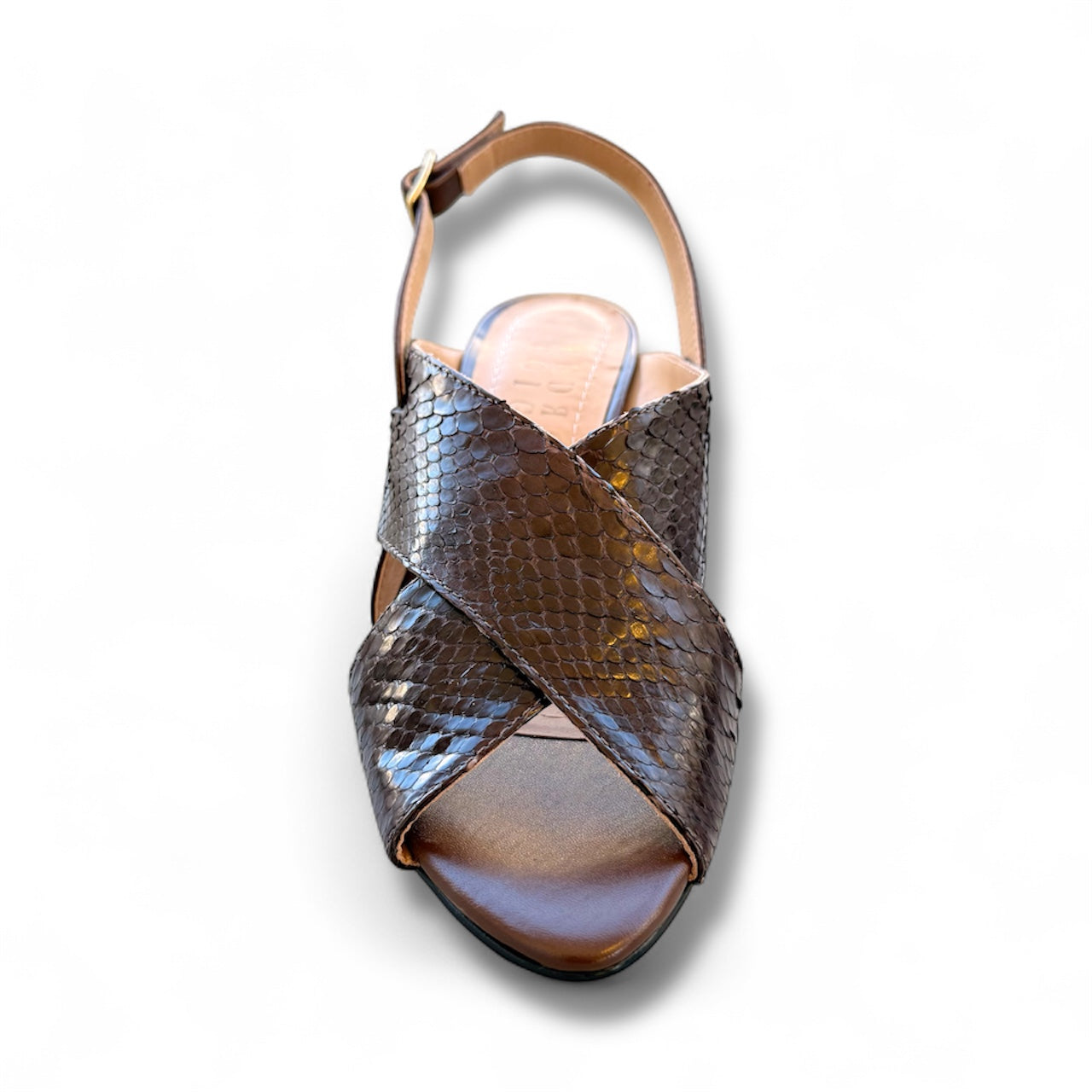 Sandália em Python e couro pelica, com salto de 6cm forrado em couro.